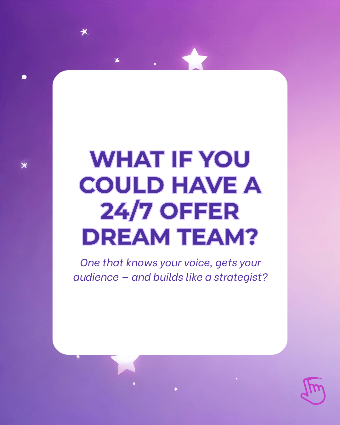 Most entrepreneurs don’t fail from lack of skill — they get stuck building in isolation. That’s why I created the OfferMojo™ Squad: a full system of AI assistants trained in my signature offer strategy and tailored to your voice, vision, and way of working. From business model clarity to magnetic messaging, this team helps you build aligned, scalable offers with confidence.